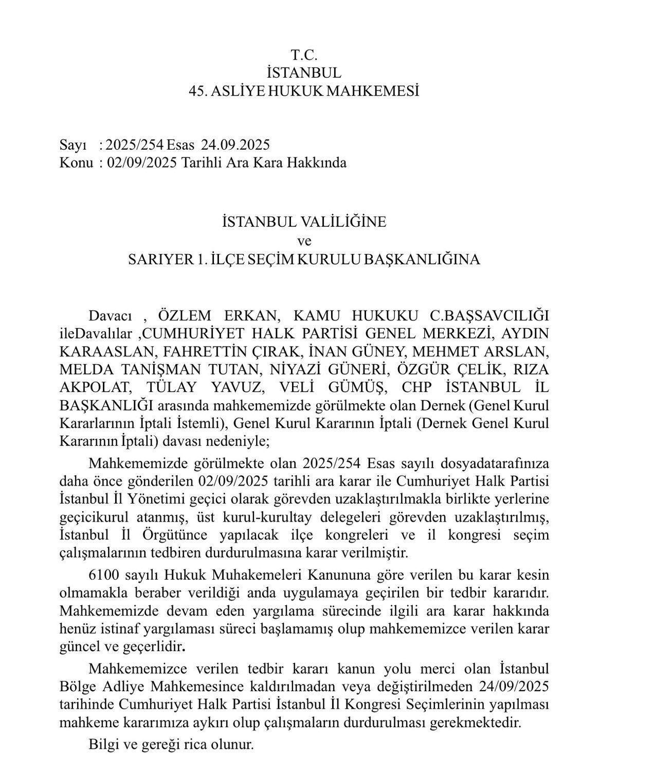 24 Eylül 2025 tarihli mahkeme yazısında, “Verilen tedbir kararı henüz istinaf yargılaması süreci başlamamış olup mahkememizce verilen karar güncel ve geçerlidir. Mahkememizce verilen tedbir kararı kanun yolu mercii olan İstanbul Bölge Adliye Mahkemesince kaldırılmadan veya değiştirilmeden 24/09/2025 tarihinde Cumhuriyet Halk Partisi İstanbul İl Kongresi Seçimlerinin yapılması mahkeme kararımıza aykırı olup çalışmaların durdurulması gerekmektedir” denildi.
